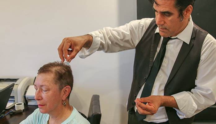 opiod Rose Hayes, 66, a client of Dr. Mario Fontes for more than four years, says auricular acupuncture helps manage her stress. (Photo by Tim Royan/Cronkite News)