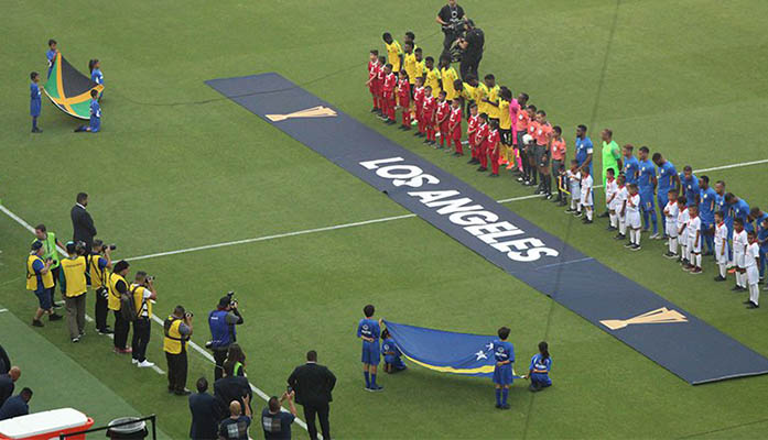soccer The Jamaican national team, including Phoenix Rising players Kevon Lambert and Junior Flemmings, stand in attention for the national anthem before its Gold Cup game. (Photo by Owain Evans/Cronkite News)