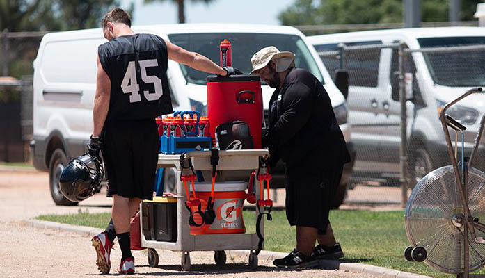 rattlers Because of the intense heat, linebacker Ryan Langford and his Arizona Rattlers teammates take frequent water breaks during outdoor practices. (Photo by Matthew Andujo/Cronkite News)