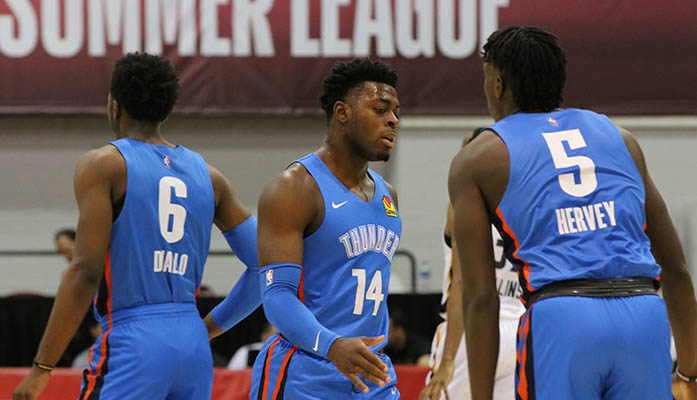 Luguentz Dort (center) wasn’t drafted, but he signed a two-way contract with the Oklahoma City Thunder and showcased his defensive skills in the NBA Summer League. (Photo by Sebastian Emanuel/Cronkite News)