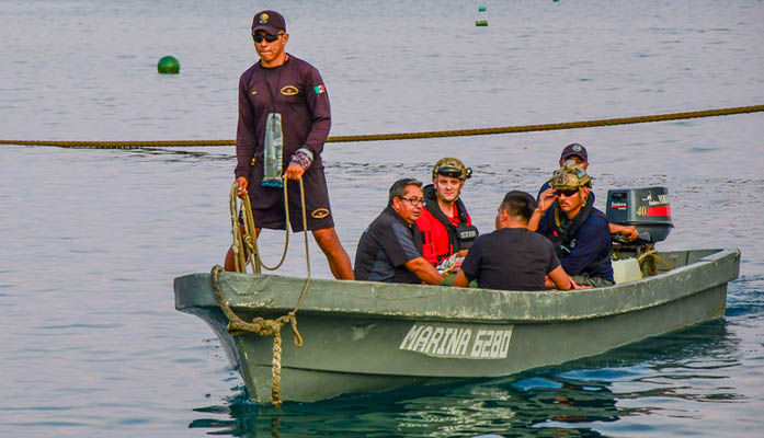 Pararescuemen from the 48th Rescue Squadron on Davis-Monthan Air Force Base, Ariz., along with the injured fishermen are transported from the Tamara to Socorro Island, Mexico, July 12, 2019. The pararescuemen transferred the fishermen to the Mexican naval medical clinic on the island where they would stay overnight. (U.S. Air Force photo by Airman 1st Class Kristine Legate)