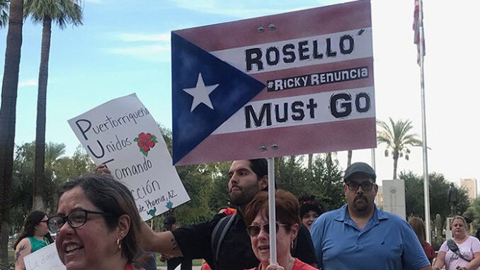 PHOENIX – Members of the Valley’s Puerto Rican community gathered Wednesday at the state capitol to demand the resignation of Puerto Rico’s Gov. Ricardo Rosselló, who has been under pressure since the leak of private chat messages exchanged by him and members of his staff.