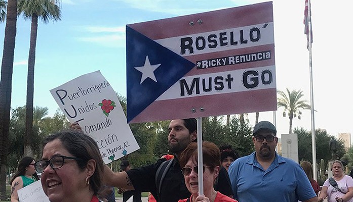 The protest was in response to the publication of offensive messages from Puerto Rico Gov. Ricardo Rosselló’s private chats. The governor also has drawn heat for the arrest of two former top aides accused of fraud. (Photo by Taniyah Williamson/Cronkite News)