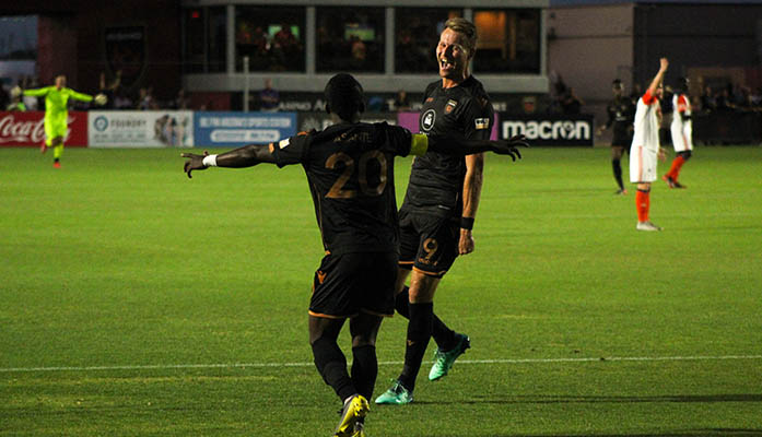 Solomon Asante (left) and Adam Jahn have combined for 16 goals during Rising’s winning streak.(Photo by Owain Evans/Cronkite News)
