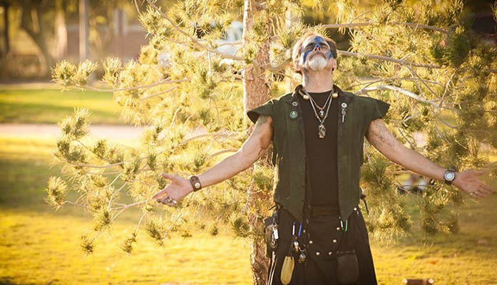 Mark Bailey at a Pagan Pride Day ritual in Steele Indian School Park. He believes that all deities are sitting at a giant table – among them Jesus and Amaterasu, the Japanese goddess of the sun. From there, they are watching us and rolling their dice to decide what we’ll do next. (Photo courtesy of Mark Bailey)