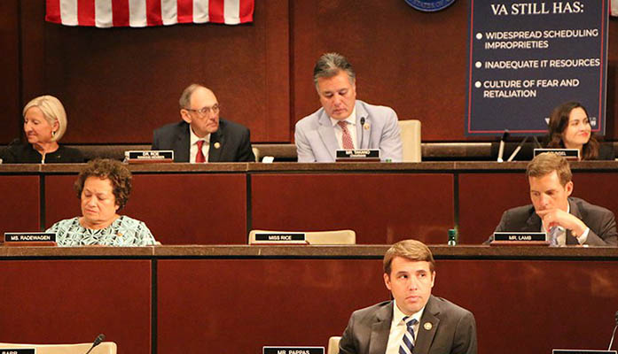 Lawmakers on the House Veterans Affairs Committee welcomed improvements in service for VA health care, but Rep. Mark Takano, D-California, center, said he worries that old problems still linger at the agency. (Photo by Miranda Faulkner/Cronkite News)