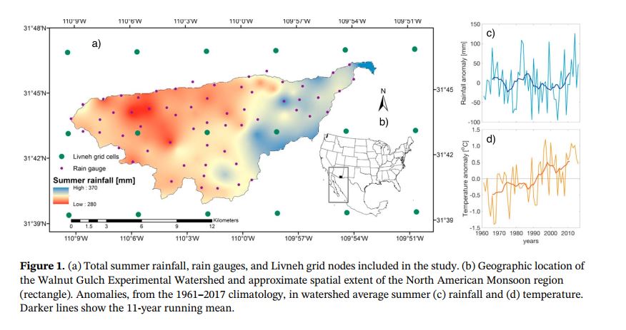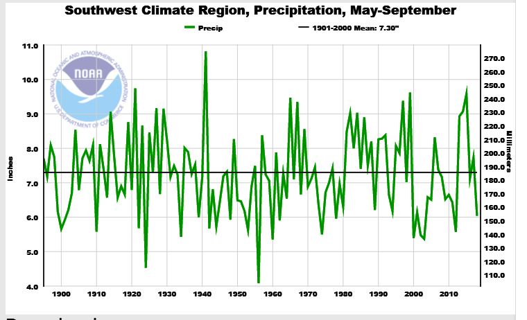 Regarding the Walnut Gulch Experimental Watershed, the researchers say “Average summer rainfall, May through September, over the watershed for the 1961–2017 period has been approximately 293 mm (112 to 370 mm range), which represents approximately 60% of the annual total (Figure 1a).” That amount seems much higher than the amounts shown on the graph of the broader southwestern region. Extrapolation of conclusions from the small study area may not be justified for the region as a whole.