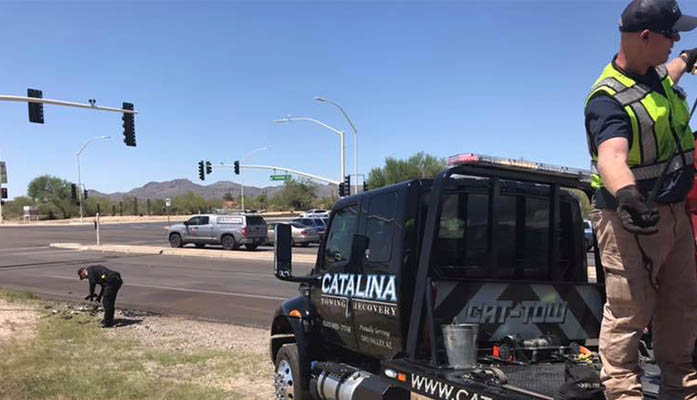 Officers and tow truck driver cleaned up debris.[Photo courtesy Oro Valley Police]