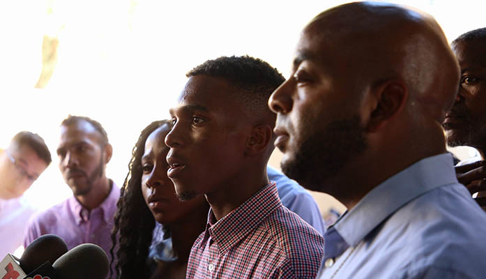 police Iesha Harper and her fiance, Dravon Ames (center) have filed a $10 million notice of claim against Phoenix in connection with a May 27 police stop. (Photo by Tanner Puckett/Cronkite News)