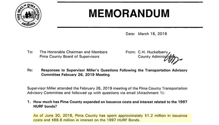 You were also told that bonds were the way to get our roads fixed. Recall the 1997 HURF road bond of $350 million that voters approved by election. According to administrator Huckelberry, that bond has cost us $89 million in interest costs and the county has finally just issued all of those bonds.