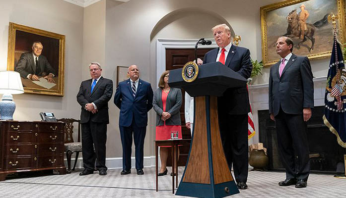 President Donald Trump, with Health and Human Services Secretary Alex Azar, left, and others, announces the release of $1.8 billion in funds for states to fight the opioid crisis. Arizona will get $20 million under the plan. (Photo by Shealah Craighead/White House)