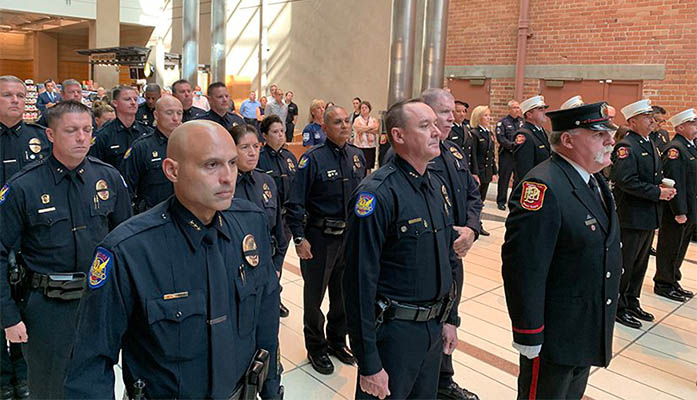 The Phoenix Police and Fire Honor Guard stood at attention for the duration of the memorial ceremony. Nearly 3,000 people died Sept. 11, 2001, when a group of terrorists hijacked four commercial jetliners – flying two into the World Trade Center and one into the Pentagon; passengers on the fourth jet overpowered the hijackers before it crashed near Shanksville, Pennsylvania. (Photo by Rio Paynter/Cronkite News)