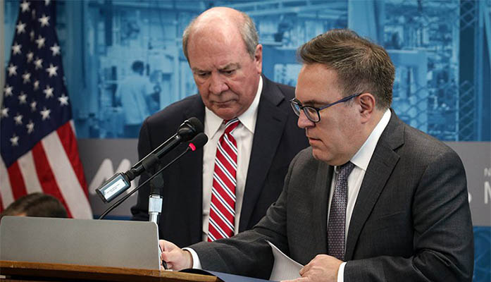Army Assistant Secretary for Civil Works R.D. James, left, and Environmental Protection Agency Administrator Andrew Wheeler sign documents for the final repeal of WOTUS, the 2015 rule Wheeler called an “egregious power grab” by the Obama administration. (Photo by Kailey Broussard/Cronkite News)