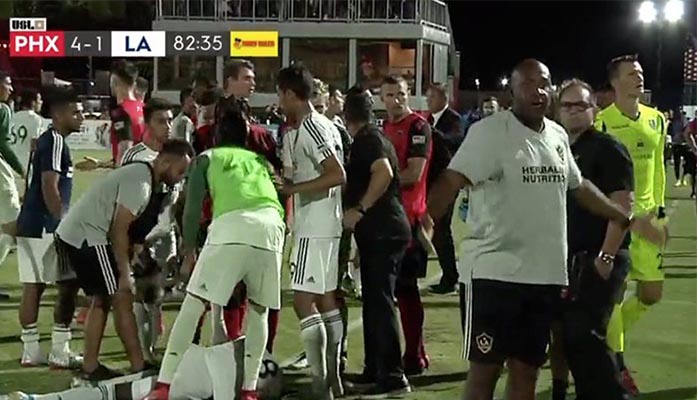 rising Players surround L.A. Galaxy II forward Augustine Williams after he was hit by an object thrown from the stands in a game against Phoenix Rising FC. The game was called out of concern for player safety. (Photo courtesy Shawn Medow via ESPN)