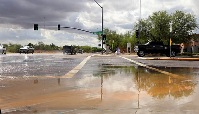 The intersection of South Crimson Road at East Baseline Road in Mesa was closed late Monday morning after rainfall in the East Valley caused severe flooding. (Photo by Cassidy McCauley/Cronkite News