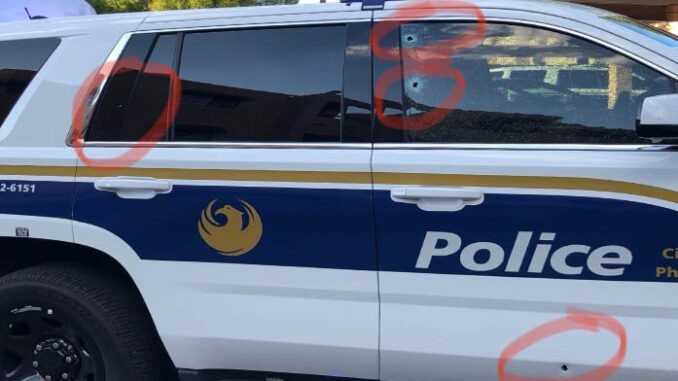 Suspect shot at Phoenix Police vehicle, including shooting out the back window. No officers injured. [Photo courtesy Phoenix PD]