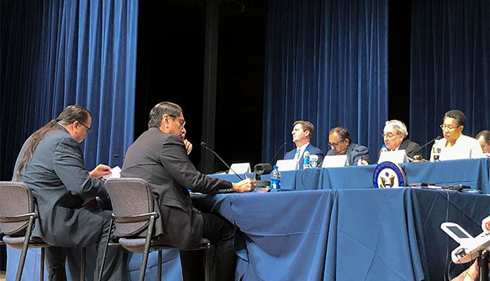 Stephen Lewis, left, governor of the Gila River Indian Community, and Jonathon Nez, president of the Navajo Nation, testify before a House subcommittee about obstacles Native Americans face when voting. (Photo by Deagan Urbatsch/Cronkite News)