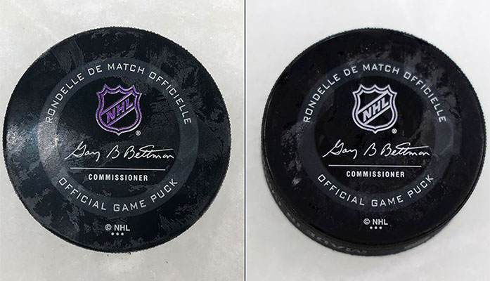 hockey NHL hockey pucks feature purple wording when they are frozen, indicating they are ready for game play. The logo and words turns white when the pucks are too warm. (Photos by Karrissa D. Herrera/Cronkite News)