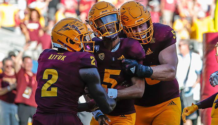 asu Arizona State quarterback Jayden Daniels (center) celebrate a touchdown with receiver Brandon Aiyuk (left) against Washington State. Both played key roles in Saturday’s victory. (Photo by Kevin Abele/Icon Sportswire)