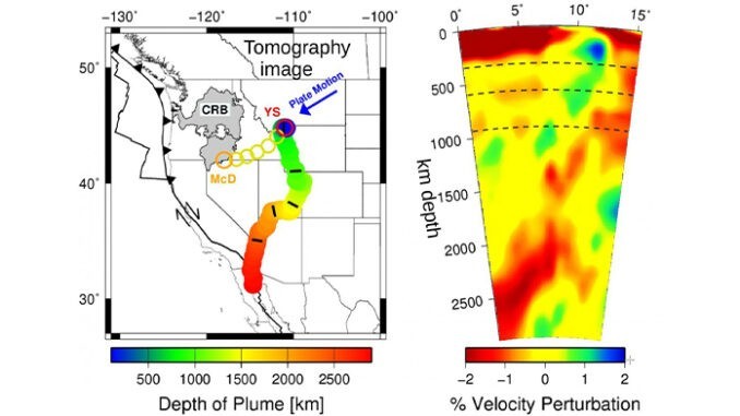According to the model, beneath the Yellowstone volcano lies a so-called mantle plume: a chimney-like structure that reaches thousands of kilometres deep to the border of the Earth’s core and mantle. The origin of the plume lies under the “Baja California”, more than a thousand kilometers southwest of the national park. Evaluations of earthquake waves had already suggested something like this, but the idea of such a “mantle plume” did not fit in with the movement of the Earth’s lithospheric plates.