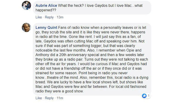 Fans of Mac Watson and Larry Gaydos visited the newly minted Gaydos In The Afternoon Facebook page and speculation as to why Mac was “disappeared” was the primary focus on discussion.