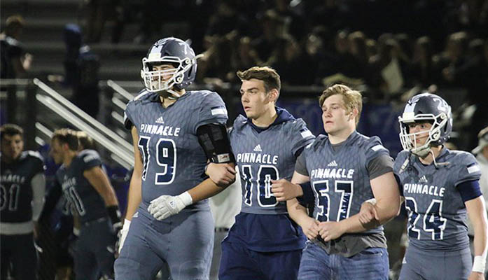 Pinnacle High School football players Tosh Baker (79), Adam Verbalatis (57) and Clay Zupke (24) walked arm and arm with J.D. Johnson (10) to honor their starting quarterback, who was forced to step away from football because of a heart ailment. (Photo by Cassidy McCauley/Cronkite News)