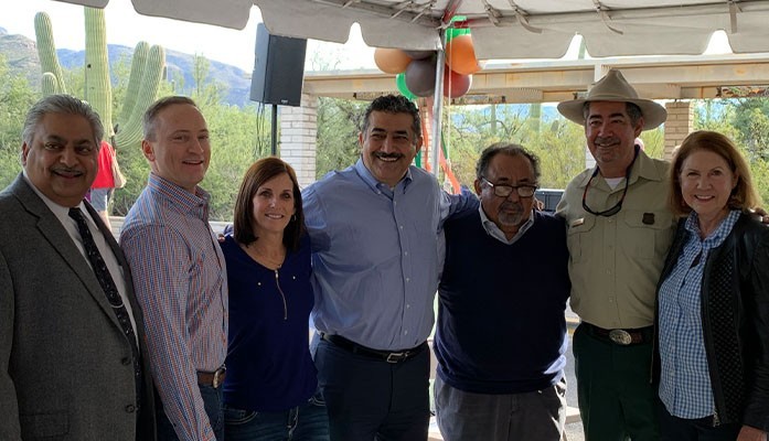 Satish Hiremath, TEP CEO David Hutchens, Sen. Martha McSally, Farhad Moghimi (Pima Association of Governments/Regional Transportation Authority), Rep. Raul Grijalva, U.S. Forest Service employee, and Rep. Ann Kirkpatrick pose for a group picture at Sabino Canyon on Saturday. [Photo courtesy Sen. Martha McSally]