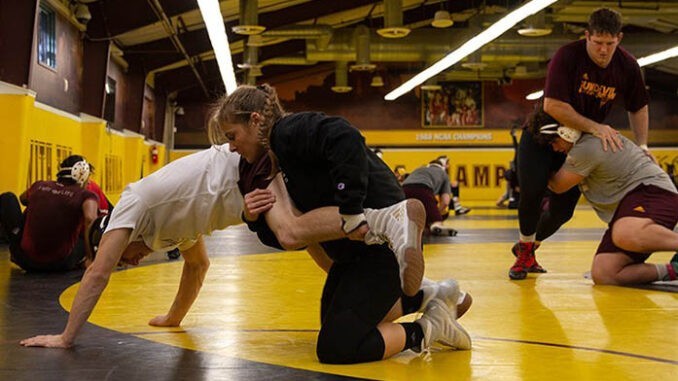 TEMPE – Walk into the Arizona State wrestling room during a practice session, and dozens of wrestlers will be sparring on the mats. Coach Zeke Jones is likely to be sitting on his exercise ball along the padded wall, chirping instructions to his athletes.