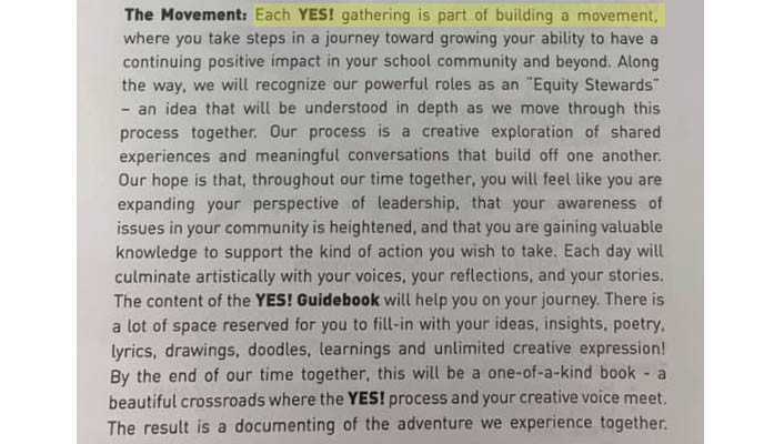 While the “Deep Equity” teacher training is problematic – drawing even complaints from teachers subjected to the material – it is the YES! program that has caused serious concerns. Specifically, activists are very concerned about the training “student leaders” are receiving through Corwin’s YES! training for students as part of “Deep Equity” program.