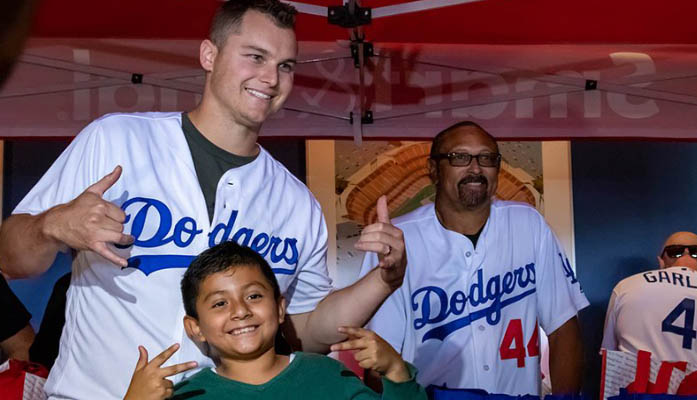 Los Angeles Dodgers outfielder Joc Pederson and former Dodgers center fielder Ken Landreaux pose with a young fan after handing out Thanksgiving turkeys and fixings. (Photo by Erica Morris/Cronkite News)