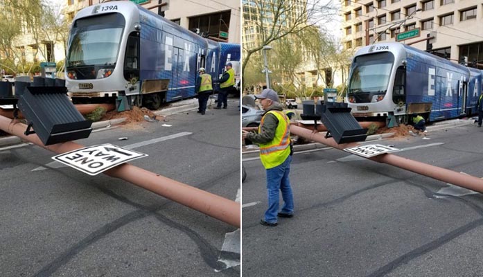 Crews clean-up debris at 1st Ave. and Washington in downtown Phoenix where a driver going the wrong way on a one way street collided with a light rail train. [Photos courtesy Phoenix Police]