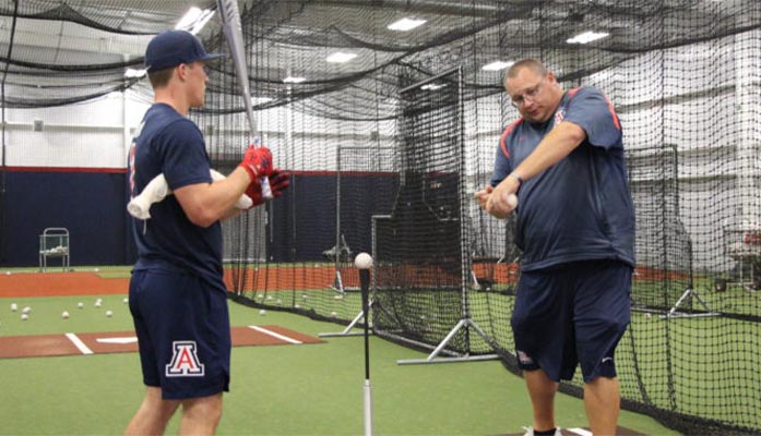coach Coach Wanaka, right, demonstrates what the player should feel during this particular drill. (Photo by Justin Wylie).