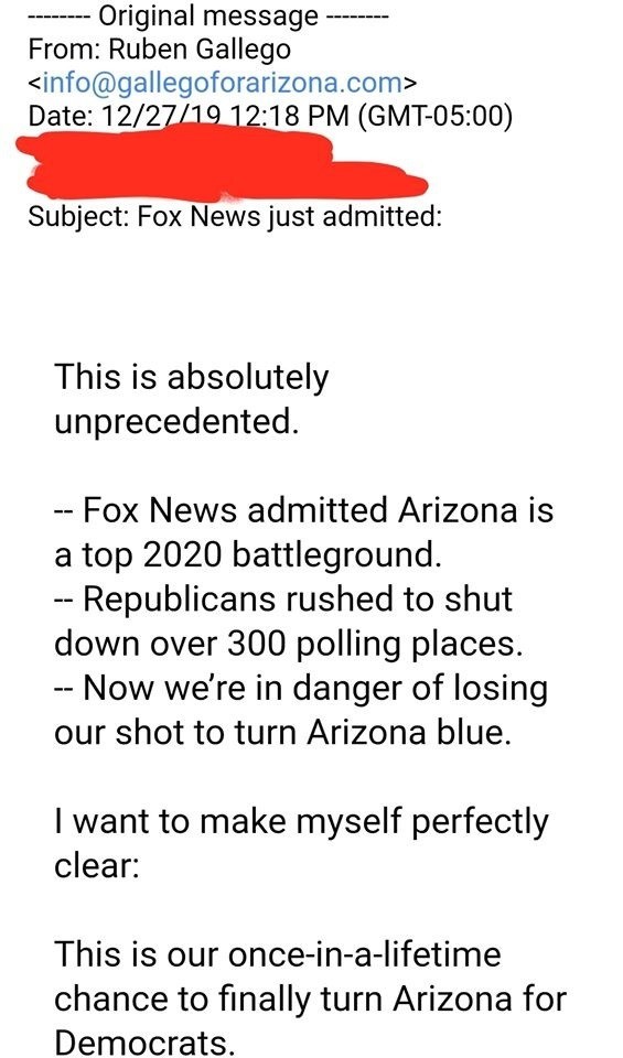 His email went on to say, “This is our once-in-a-lifetime chance to finally turn Arizona for Democrats.”