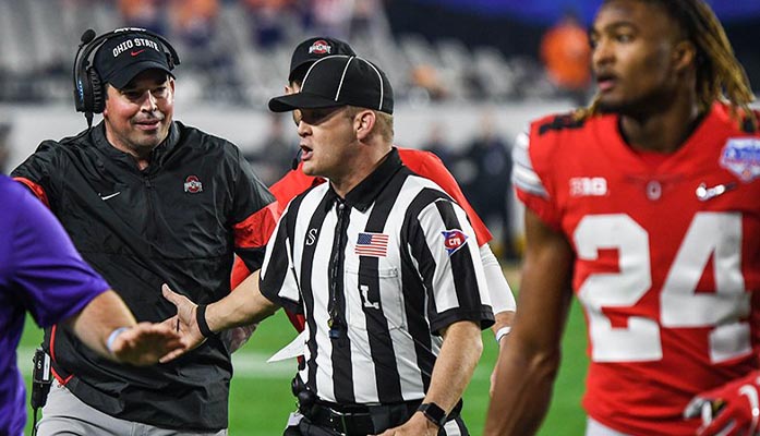 Ohio State coach Ryan Day (left) expresses his displeasure to the referee after a targeting penalty was called on cornerback Shaun Wade (right) in the Fiesta Bowl. (Photo by Brady Vernon/Cronkite News)