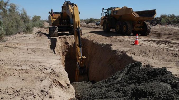 Army Corps of Engineers contractors pour concrete in August for the base of a new section of border wall near Yuma. The Department of Homeland Security waived environmental and other regulations on 90 miles of Arizona’s border last year to smooth the way for border wall construction projects. (Photo by Vincent Mouzon/Army Corps of Engineers)