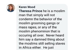 Karen Wood claims Ahmed is a supporter of gang rapes, Sharia Law, and slavery, all while repeatedly referring to him as a “Moslim,” the derogatory term for Muslims.