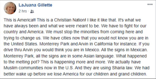 LaJuana Gillette’s feelings don’t appear to be limited to just Muslims, as she wants a GOP and an entire country that refuses to accept minorities altogether.