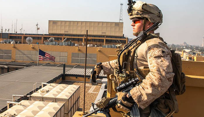 A Marine stands guard at the U.S. Embassy complex in Baghdad, Iraq, on Jan. 3. Tensions in the Middle East earlier this month led the House to push measures that would block war with Iran or make it harder for the president to initiate military action. (Photo by Sgt. Kyle C. Talbot/U.S. Marine Corps)