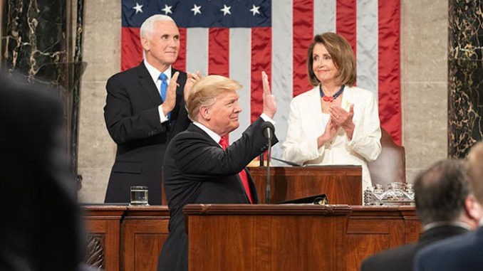 President Donald Trump, shown here at the 2019 State of the Union address, has promised a “very, very positive” address Tuesday night. But some analysts wonder how positive it can be coming a day before the Senate is to vote on his impeachment. (Photo by Shealah Craighead/The White House)