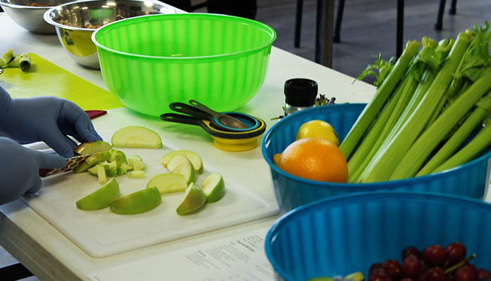Diabetes nutrition technician Mallory Smith chops an apple for a chicken Waldorf salad at Native Health in Phoenix on Jan. 23. Diabetics are taught to prepare healthy recipes during the free, 20-week Food for Thought program, which is open to everyone. (Photo by Alicia Moser/Cronkite News)