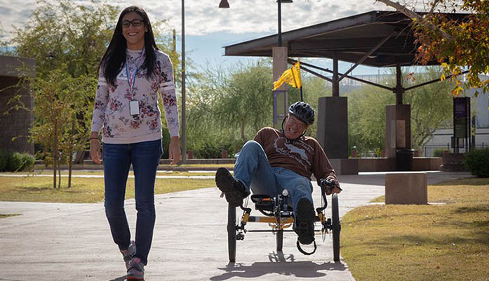 Johanna Avilez (left) walks beside Vietnam vet Steven Barthle during a biking clinic. “The way adaptive sports is evolving, and including PTSD, anxiety and depression is only a benefit for veterans and their care and quality of life. (Photo by Sara Abbott/Special for Cronkite News)