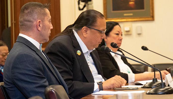 Gila River Indian Community Gov. Stephen Roe Lewis, center, said his tribe is working to solve funding problems, but the federal government has to do its share. He is with Muckleshoot Tribe Council Member Louie Ungaro, left, and Martina Hinds, president of the National Indian Education Association. (Photo by Joshua Gerard Gargiulo/Cronkite News)