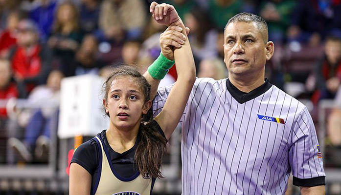 Erica Pastoriza of Raymond S. Kellis High in Glendale has her arm raised by an official after capturing third place in the 101-pound weight class at[1] the 2020 AIA Girls Wrestling State Championships. The amount of girls wrestling in Arizona has almost doubled in one year. (Photo by Travis Whittaker/Cronkite News)