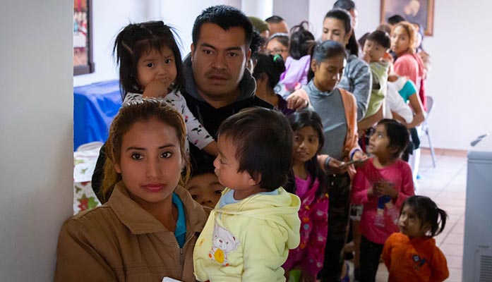 Maribel López and her family wait in line to receive vaccinations at Casa del Migrante, just south of the Mexico border. About 120 people were given a variety of shots at a one-day clinic last month. (Photo by Delia Johnson/Cronkite News)