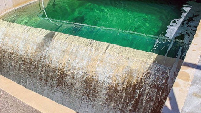 This waterfall moves treated wastewater into one of two reservoirs at a rate of 50,000 gallons per minute to supply water to cool the nuclear reactors at Palo Verde. (Photo by Alicia Moser/Cronkite News)