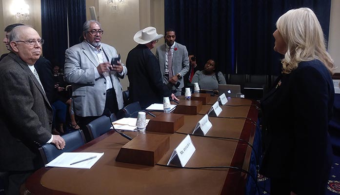 Rep. Debbie Lesko, R-Peoria, speaks with Tohono O’odham Chairman Ned Norris Jr., left center, after a Homeland Security subcommittee hearing on the impact of border wall construction on private and tribal land. Norris opposes the wall while Arivaca rancher Jim Chilton, in hat, supports it. (Photo by Joshua Gerard Gargiulo/Cronkite News)