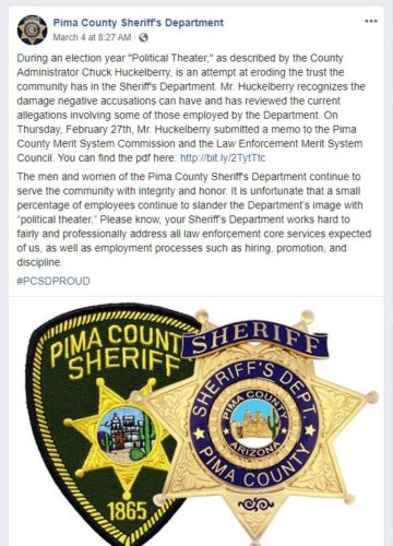 A decision by the Pima County Merit System Commission in January to overturn a suspension imposed on a longtime member of the Pima County Sheriff’s Department (PCSD) was the result of an intentional effort to embarrass Sheriff Mark Napier in an election year, according to a claim by County Administrator Chuck Huckelberry.