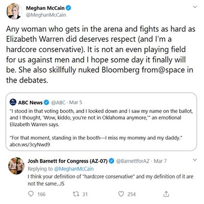 Of all the responses McCain could have focused on, having her “hard-core” conservative credentials challenged was the one she couldn’t let go. Her response though, was vintage McCain family.