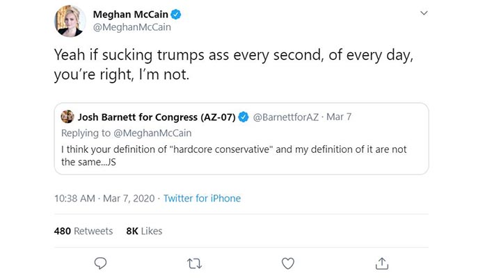 The vulgarity was such that it drew the attention of James T. Harris, the same Black conservative radio show host that Meghan’s father, the late Sen. John McCain had dissed years ago. When Harris went to McCain’s twitter feed to see what all the fuss was about, he discovered that she had blocked him.
