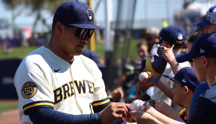 baseball Spring training was one of the ways fans could interact with players, as Milwaukee Brewers outfielder Avisail Garcia is doing at American Family Fields of Phoenix. (Photo by Reno Del Toro/Cronkite News)